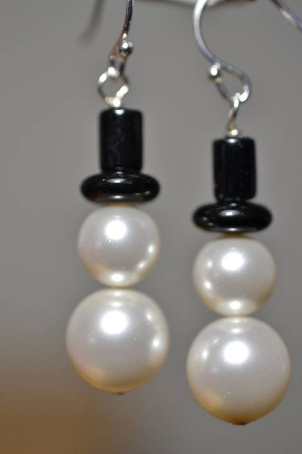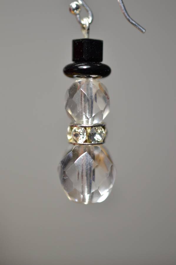 If you are planning on placing a turned snowman in the ornament then the snowman needs to be attached to the finial before gluing the wires. I have found that putting a eyepin in the cap allows for an earring to hang within the ornament. Stacking two crystal pearl beads, a black flat bead and then a black tube bead makes for an eye catching snowman that shimmers and seams to float within the ornament. A basic book on jewelry fabrication or even just following the directions on one of the many web sites can show how easily the jewelry items can be fabricated.