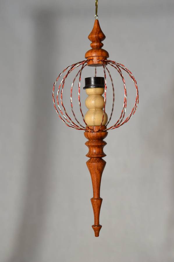 Thought should be given to the theme the ornament will be attempting to display before assembling (gluing the wires). The article within Woodturning Design did not mention putting any item within the ornament but I have found the ornament captures more attention with something either sitting on top of the finial or swinging from the cap. I have spun miniature snowmen to sit on the finial. Paint pens can help color the snow man’s top hat black if you do not want to use ebony. For one ornament I turned a miniature sombrero to hang within an ornament that was Cinco-de-Meyo themed. The ornament with the Cinco-de-Meyo theme also had three twisted wires of the appropriate colors to match the Mexican flag. After figuring that a small eye hook can be screwed into the cap to hang the sombrero I realized there are many other items that can be put in ornaments.